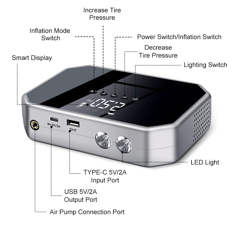 Termékfunkciók: Indítás / Felfújás / Töltés / Világítás