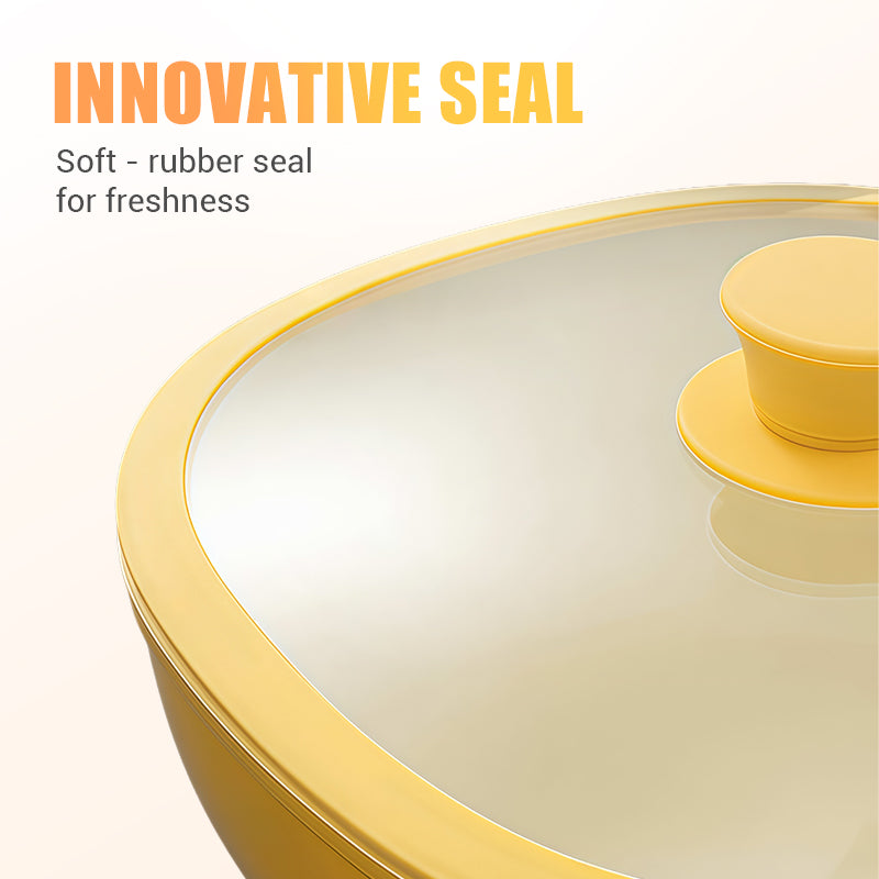 INNOVATÍV TÖMÍTŐFEDÉL - A serpenyő átlátszó fedele élelmiszeripari minőségű szilikon tömítőgyűrűvel rendelkezik a szélén. Szorosan illeszkedik a serpenyő széléhez, így mikro-magas nyomású környezetet hoz létre. Ez felgyorsítja az összetevők lágyulását és megőrzi a frissességet, javítva az étel ízét és kiváló főzési élményt biztosítva.