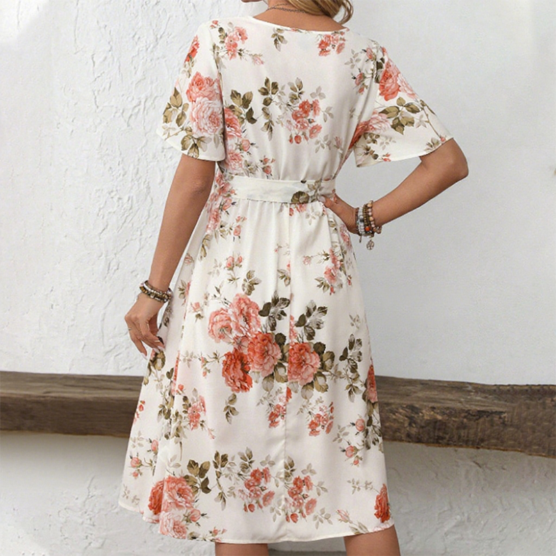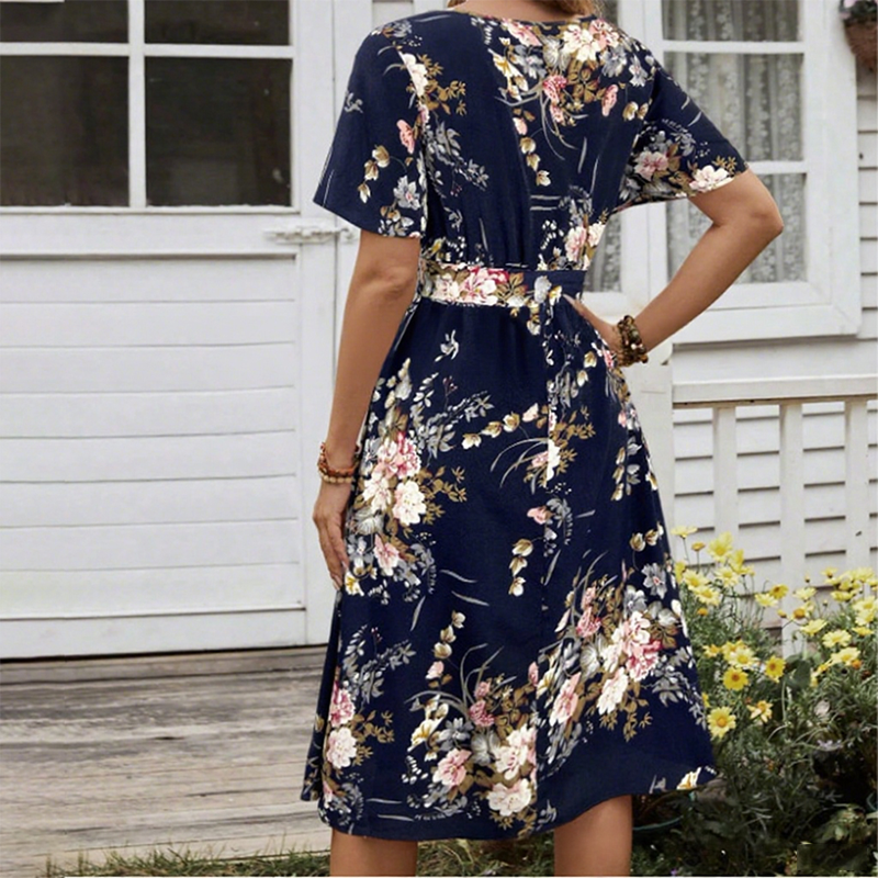 A VIRÁGOS ELEGANCIA KERTJE – Finom virágmotívumok táncolnak a ruhán, életre keltve a virágzó kertek lágy romantikáját. Az arányos, elegáns minta minden alaknak jól áll, és könnyedén átvezet a nappali viselettől az esti megjelenésig – egy viselhető tavaszi-nyári frissesség.