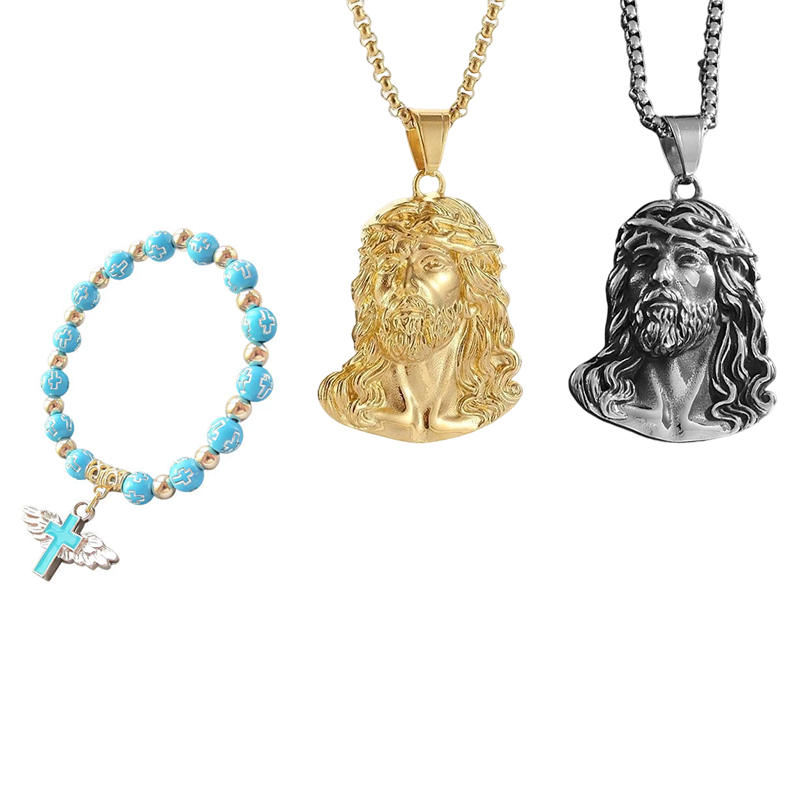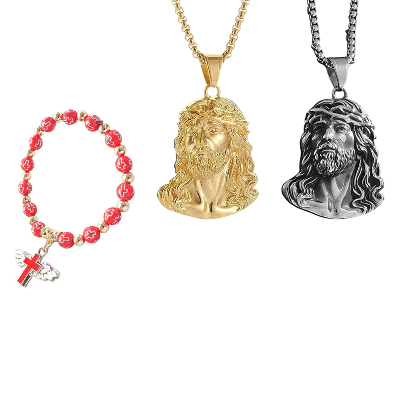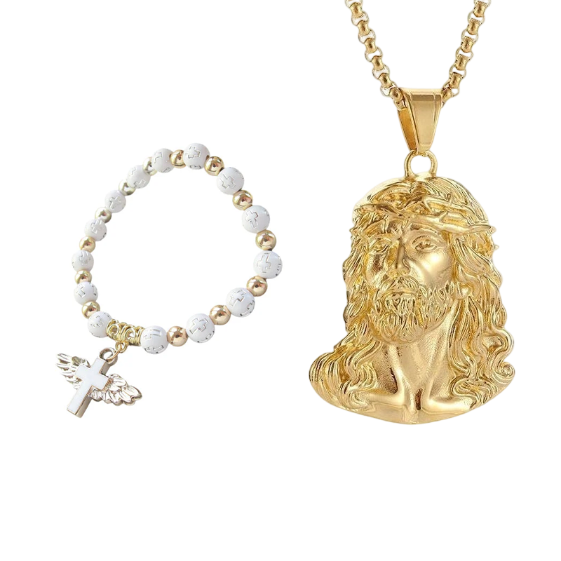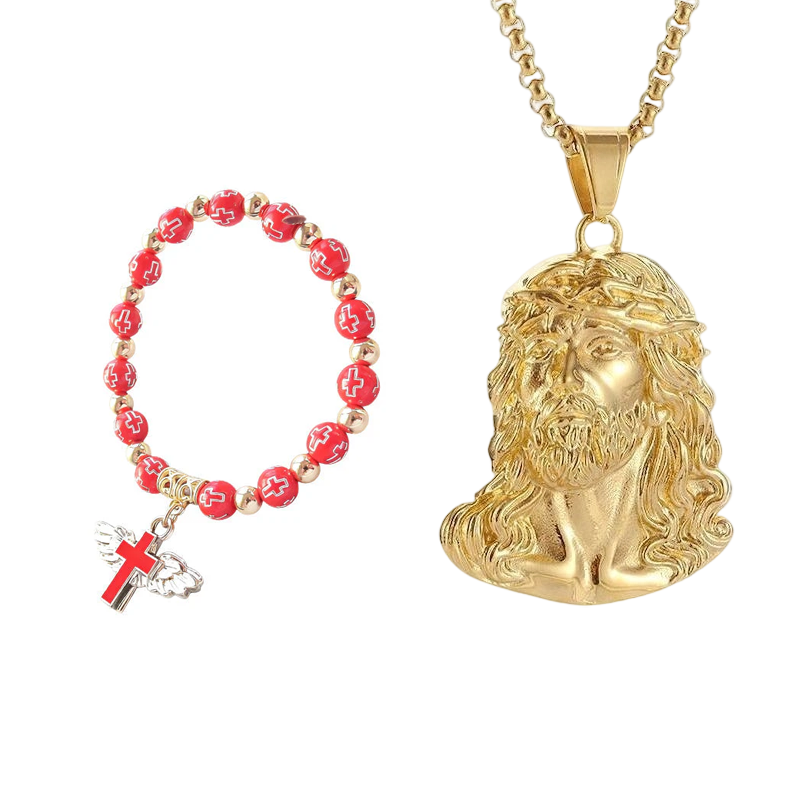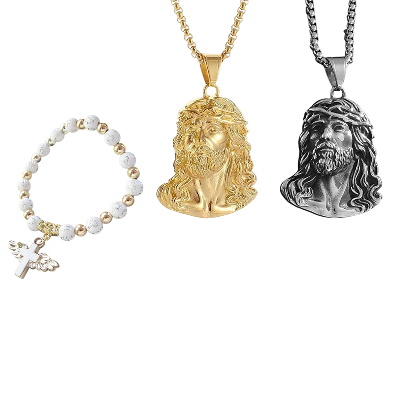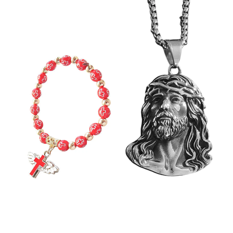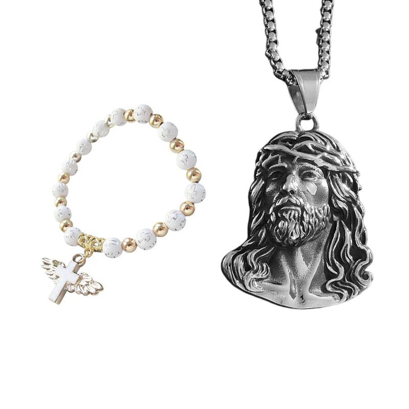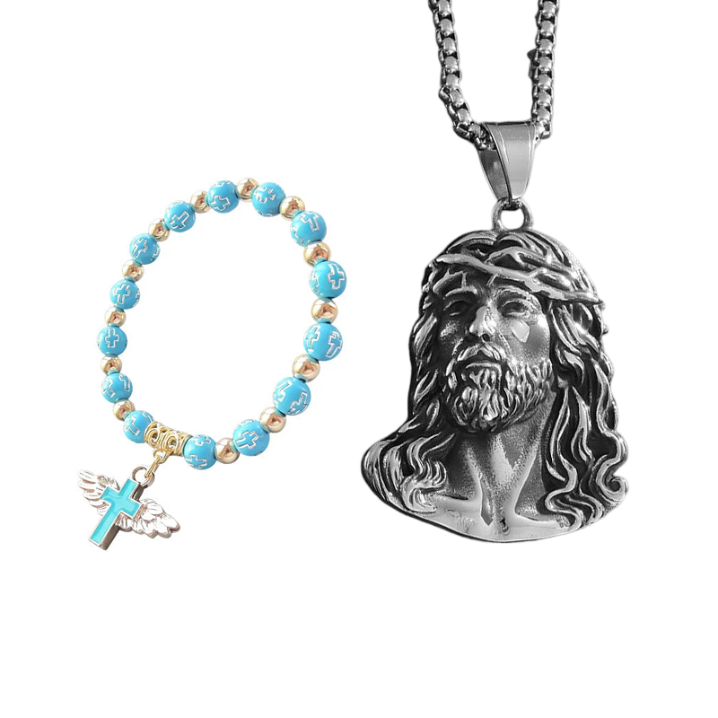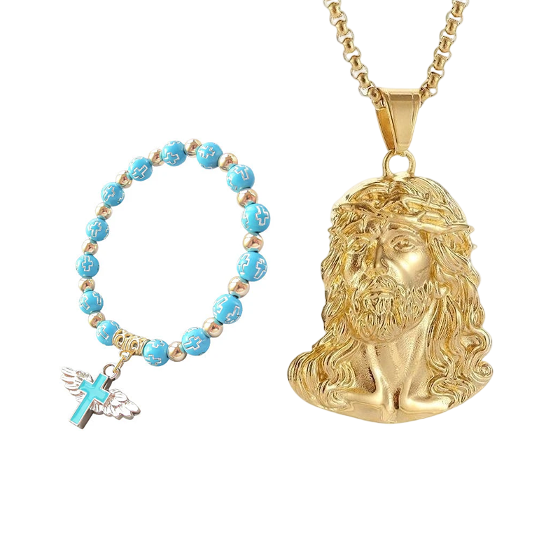 A csomag tartalma: 1 * Jézus fej medál nyaklánc/2 * Jézus fej medál nyaklánc/1 * Jézus fej medál nyaklánc+Kereszt karkötő*1/2 * Jézus fej medál nyaklánc+Kereszt karkötő*1