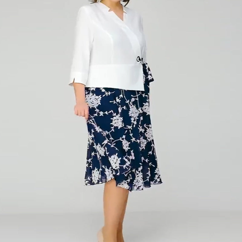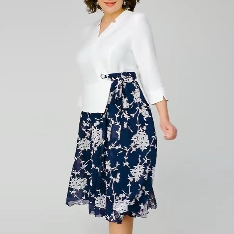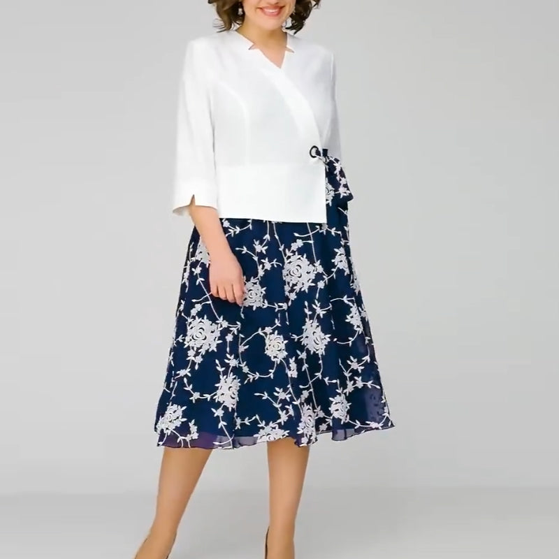 A-vonalú, karcsúsított míder: Az illeszkedő míder finoman öleli be a derekát, mielőtt egy virágos A-vonalú szoknyába ömlene. Ez az okos konstrukció hasfedést biztosít (3-5 cm megkönnyíti), miközben a kontrasztos varrással homokóra sziluett illúzióját kelti.