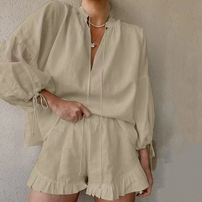 KEDVES NĆIES SZILUETTâ MĂ©ly V-nyakĂș, kötĆs gallĂ©rral Ă©s puffos ujjakkal, amelyek elegĂĄns, romantikus megjelenĂ©st kölcsönöznek. A fodros szegĂ©lyƱ, rugalmas derĂ©kĂș rövidnadrĂĄg jĂĄtĂ©kos, mĂ©gis kifinomult hatĂĄst kelt, Ă©s minden alkatnak jĂłl ĂĄll.